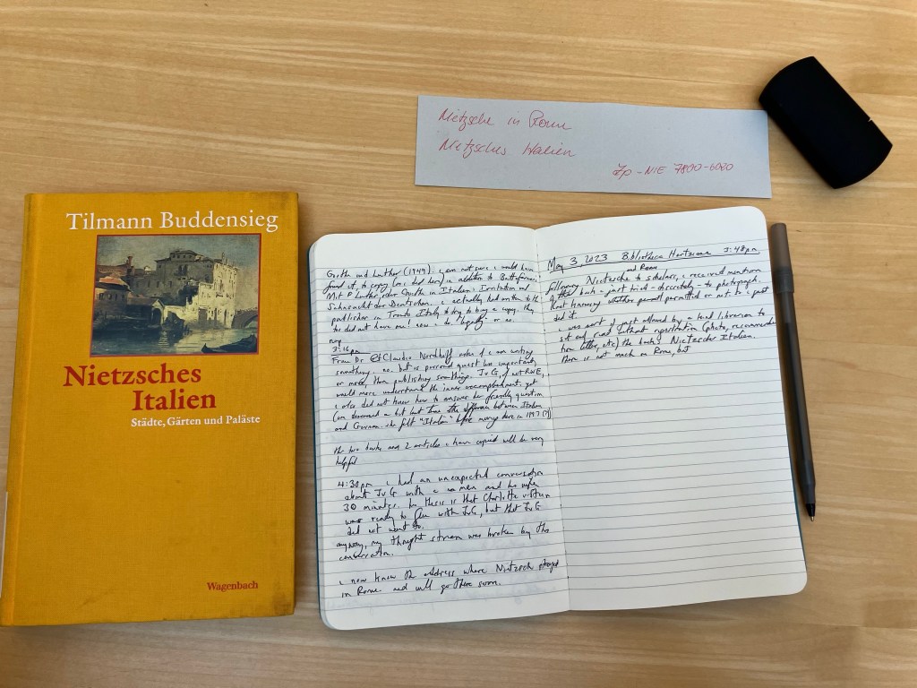 Learning via email from an Italian scholar of a book on Nietzsche and Rome, rather Italy, I located it here (via Urbis) in this research library, and a kind librarian woman let me just sit and read it. Legally or not — successfully discretely or not — I read then photoed the chapter on FN and Rome, plus intro. I was facing needing a photo, letter of recommendation, et al just to get in…