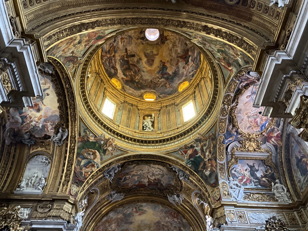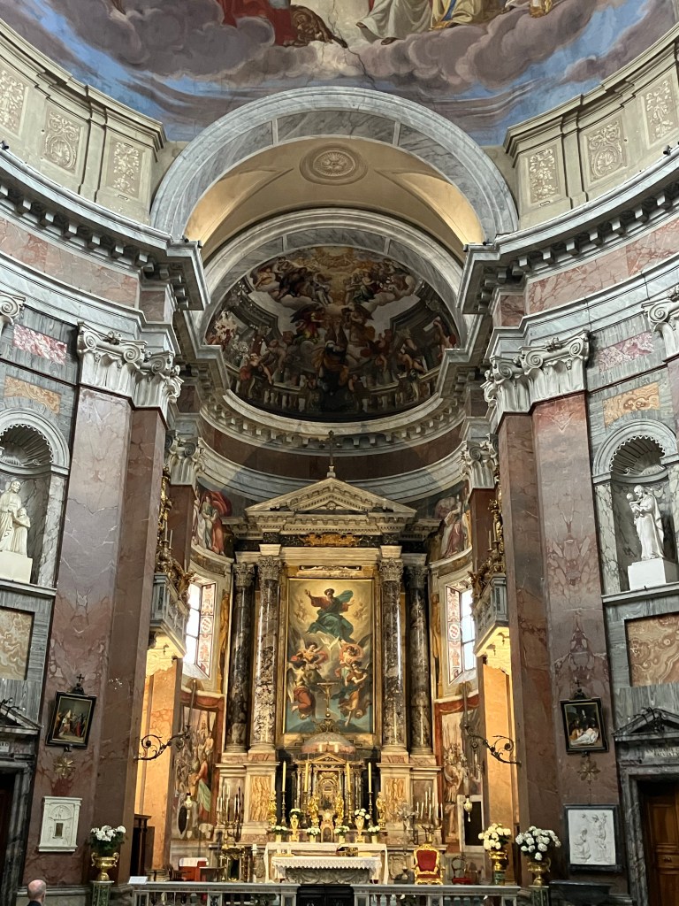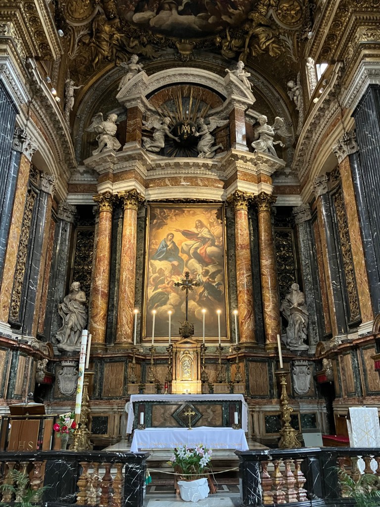 An other churchan (I think) kneels at the left recess of the Church before a painting with Jesus apparently holding a red flag, the Standard of the Society of Jesus, with Ignatius. (Reading about it, I learn this painting actually descends to reveal a French-Occupation melted down statue of Loyola. Called a “Baroque Machine”!