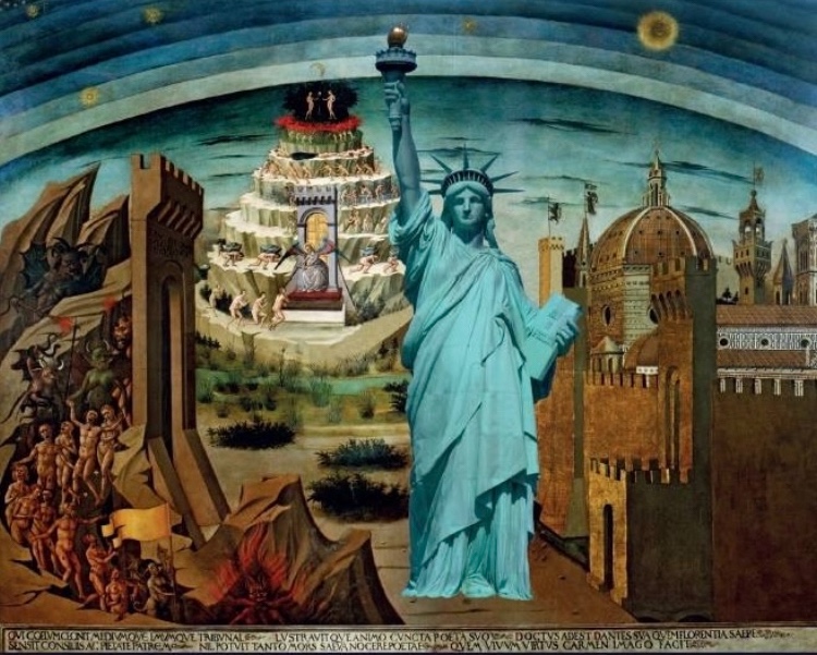 While I would now diminish the size of the “Statue of Liberty”, not only a moral cosmology of life and world, but a “philosophy of history” ate present in this cover image – which I conceived, and a Russian helped me render – of my second unread book. My second, bestunseller.