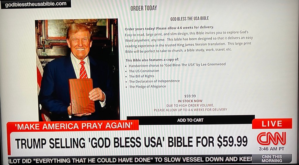 Posted on March 27, 2024 The Trump Bible, only $59.99 Let us have Christian compassion for those incapable of discerning that they are so obviously being conned.